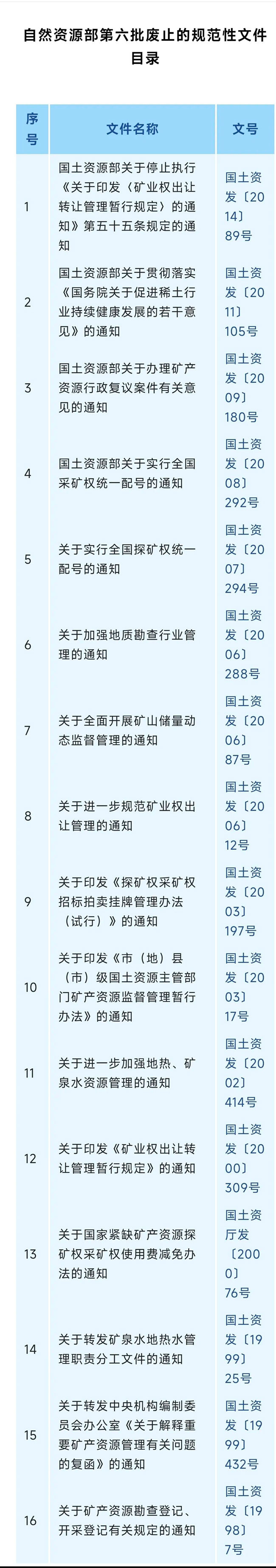 日前,《自然資源部第六批廢止的規(guī)范性文件目錄》公布,廢止16件涉及礦產(chǎn)資源管理的相關(guān)規(guī)范性文件(詳見下表)。