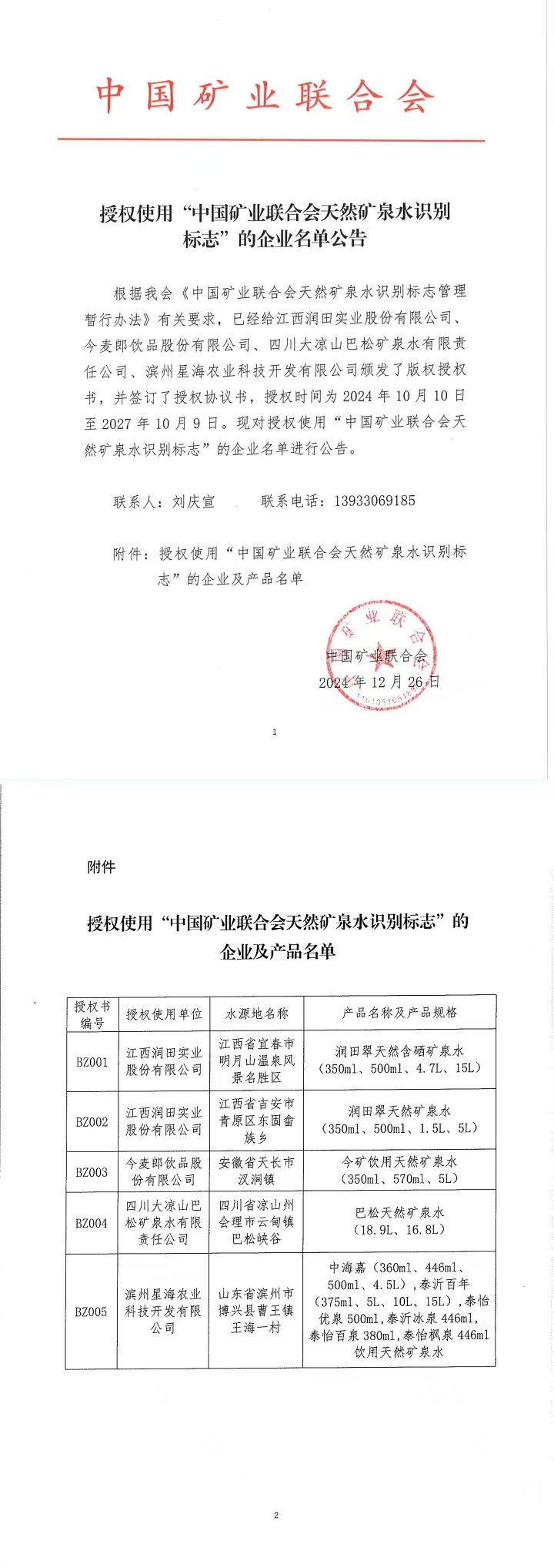 《中國礦業(yè)聯(lián)合會(huì)天然礦泉水識(shí)別標(biāo)志管理暫行辦法》自 6月20日向社會(huì)公開發(fā)布以來,在飲用水市場引起積極反響,已有多家會(huì)員企業(yè)按要求向我會(huì)提供相關(guān)材料,申請(qǐng)授權(quán)使用“中國礦業(yè)聯(lián)合會(huì)天然礦泉水識(shí)別標(biāo)志”。經(jīng)嚴(yán)格審核,業(yè)已為江西潤田實(shí)業(yè)股份有限公司等四家公司頒發(fā)版權(quán)授權(quán)書并簽訂了授權(quán)協(xié)議書,授權(quán)時(shí)間為2024年10月10日至2027年10月9日?,F(xiàn)對(duì)授權(quán)使用“中國礦業(yè)聯(lián)合會(huì)天然礦泉水識(shí)別標(biāo)志”的首批企業(yè)名單進(jìn)行公布(見附件)。