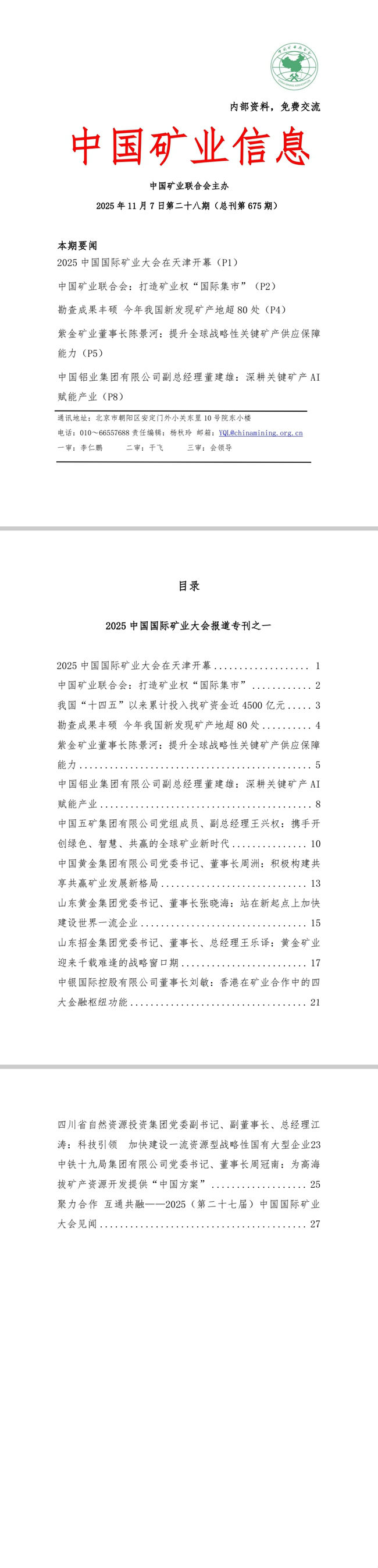 2025年11月3日—11月7日《中國礦業(yè)信息》第二十八期(總刊第675期)