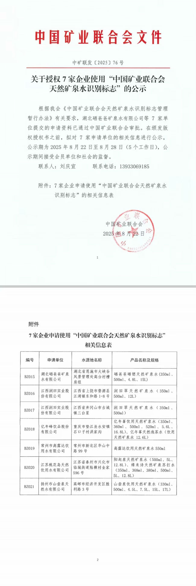 關(guān)于授權(quán)7家企業(yè)使用“中國(guó)礦業(yè)聯(lián)合會(huì)天然礦泉水識(shí)別標(biāo)志”的公示