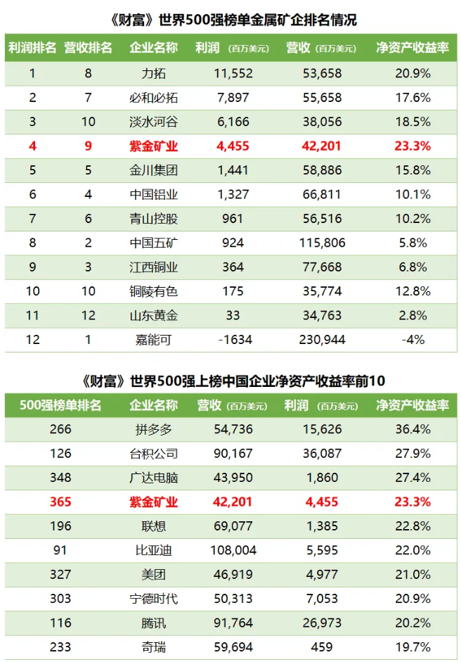 7月29日,2025年《財(cái)富》世界500強(qiáng)排行榜發(fā)布,榜單以營收為排名依據(jù),紫金礦業(yè)連續(xù)5年上榜,今年位居第365位。若從盈利指標(biāo)看,紫金礦業(yè)利潤居總榜單第209位和全球金屬礦企第4位,凈資產(chǎn)收益率(ROE)居上榜中國企業(yè)第4位、全球金屬礦企第1位。