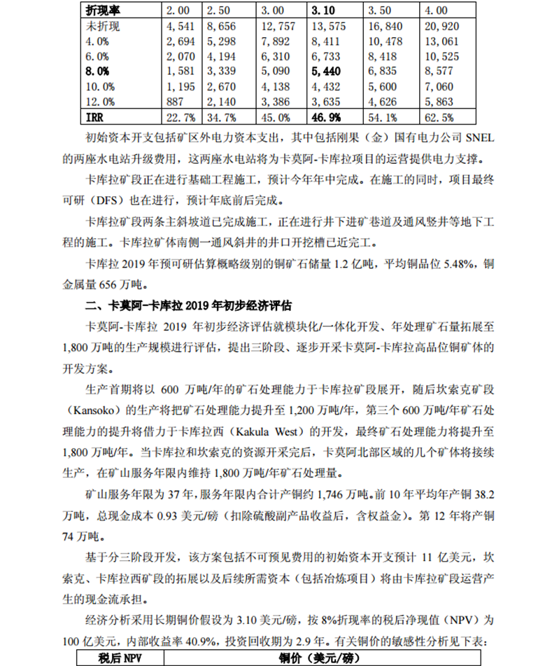 經(jīng)濟(jì)分析采用長期銅價假設(shè)為 3.10 美元/磅。包括不可預(yù)見費(fèi)在內(nèi)的初始資本開支預(yù)計 11 億美元。按 8%折現(xiàn)率的稅后凈現(xiàn)值(NPV)54 億美元,內(nèi)部收益率(IRR)46.9%,投資回收期 2.6 年。