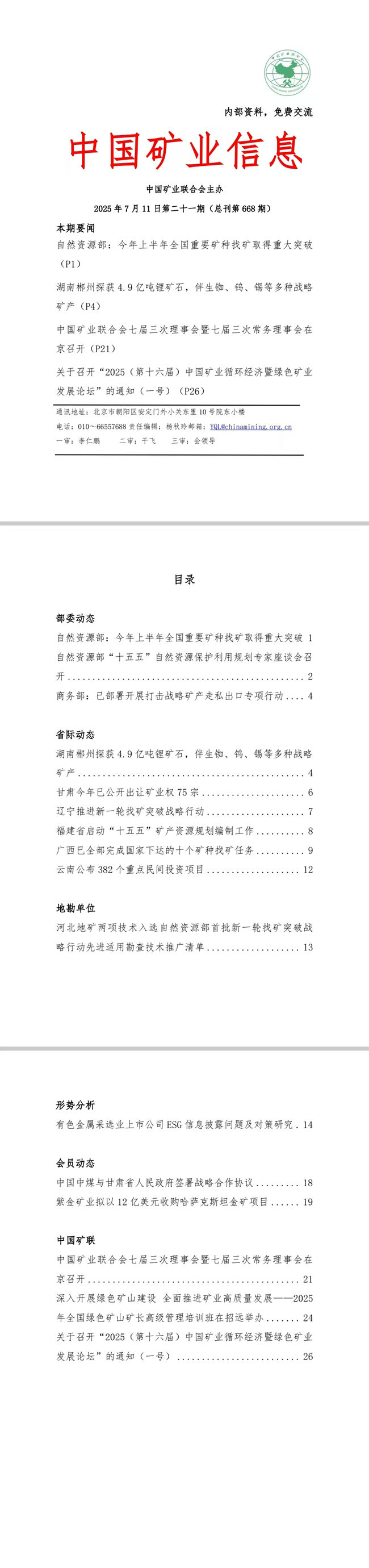 2025年7月7日—7月11日《中國礦業(yè)信息》第二十一期(總刊第668期)