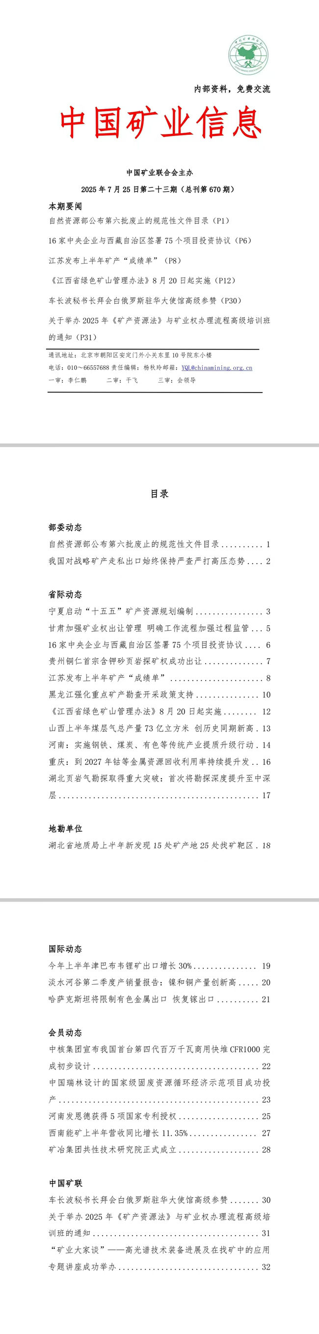 2025年7月21日—7月25日《中國礦業(yè)信息》第二十三期(總刊第670期)
