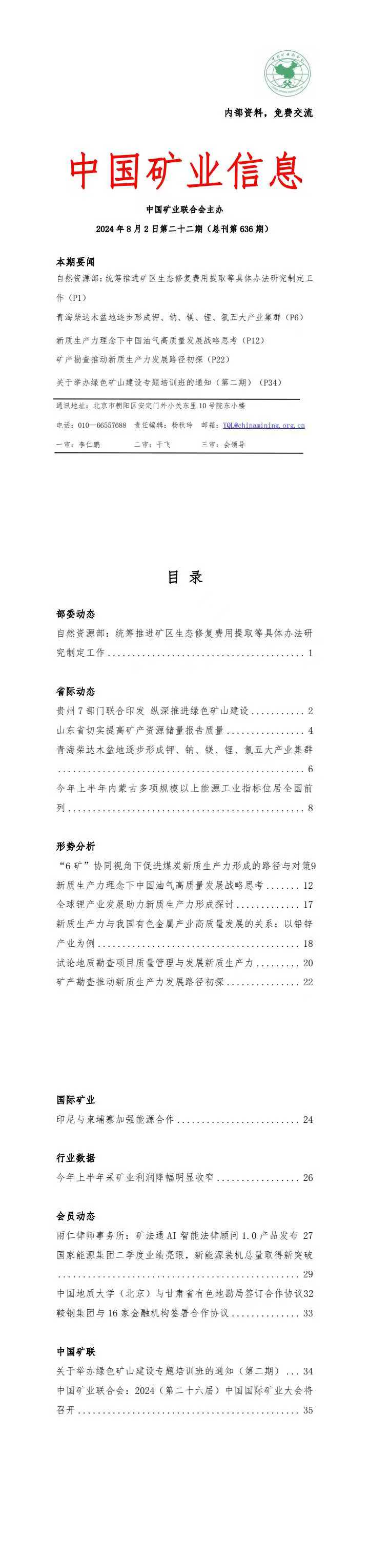 中國礦業(yè)網(wǎng):2024年7月29日—8月2日《中國礦業(yè)信息》第二十二期