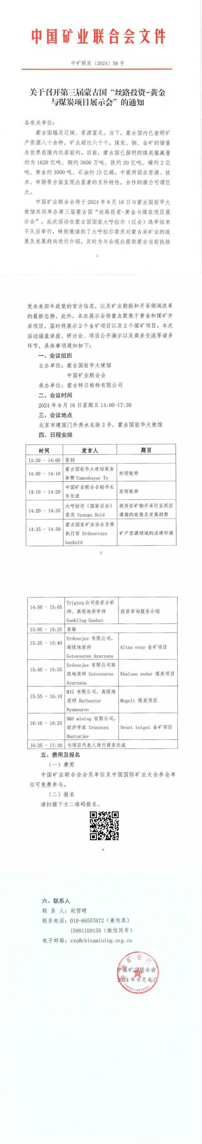 關(guān)于召開第三屆蒙古國“絲路投資-黃金與煤炭項目展示會”的通知