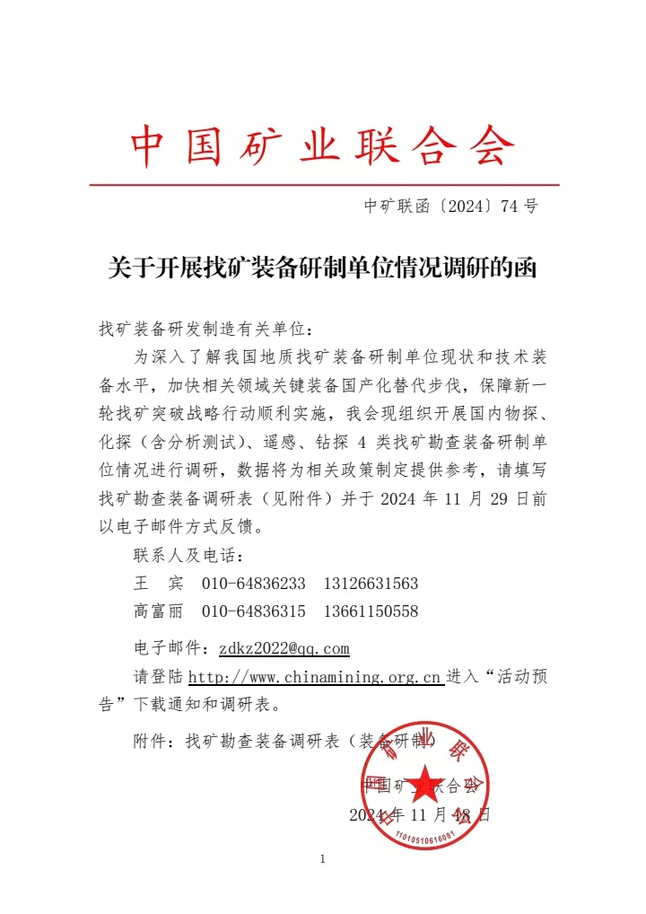 中國(guó)礦業(yè)聯(lián)合會(huì):關(guān)于開(kāi)展找礦裝備研制單位情況調(diào)研的函