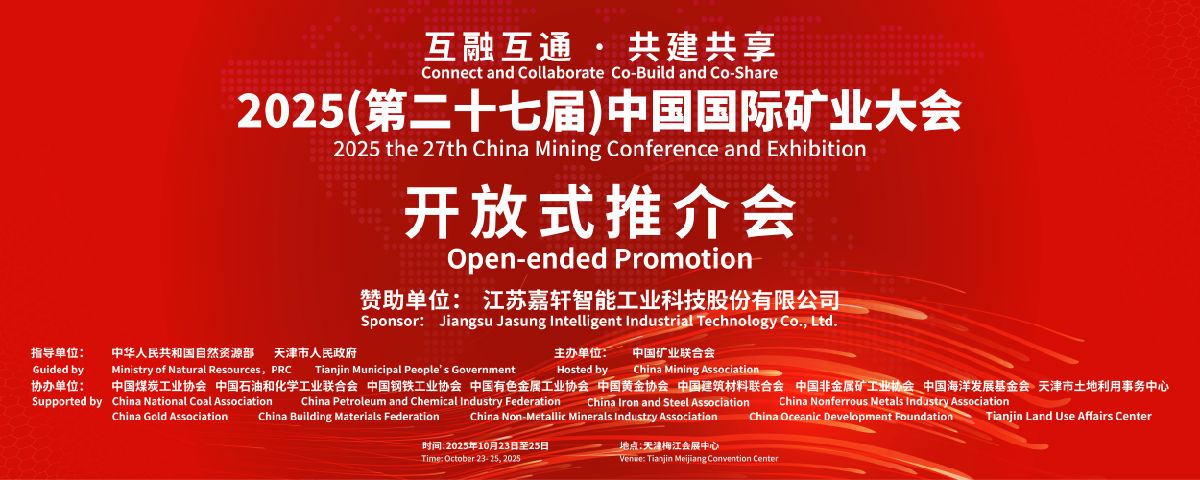 This golden autumn,the mining gathering converges again in Tianjin.The Open Promotion Session of the 2025(27th)China Mining Conference and Exhibition will be held from October 23rd to 24th in the main hall on the first floor of the Tianjin Meijiang Convention Center.Hosted by the China Mining Association and supported by Jiangsu Jasung Intelligent Industrial Technology Co.,Ltd.,this year's Open Promotion Session,under the theme"Connect and Collaborate Co-Build and Co-Share,"focuses on the core of"Technological Innovation Empowering High-Quality Development in Mining."It brings together the wisdom and strength of the mining sector to create an innovative exchange feast covering the entire industry chain.