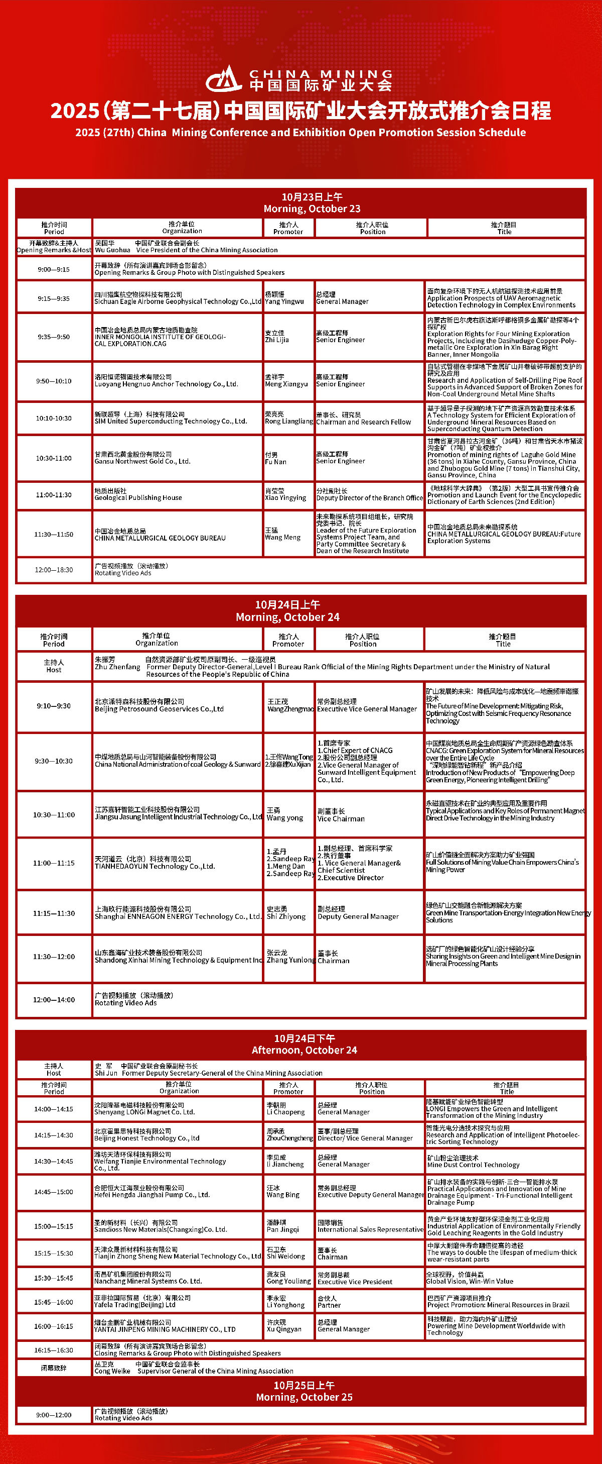 As an important part of the China Mining Conference and Exhibition,this year's Open Promotion Session has undergone comprehensive upgrades based on the success of last year's event.The schedule is compact and substantial.Over the two days of October 23rd and 24th,24 industry experts and corporate leaders will deliver 22 heavyweight presentations.The content spans diverse fields including cutting-edge exploration technologies,intelligent equipment applications,green development solutions,high-quality mining rights promotions,and industry book releases.From"high-precision"exploration technologies like UAV aeromagnetic detection and superconducting quantum detection to practical applications of intelligent equipment such as permanent magnet direct drive and intelligent photoelectric sorting;from green exploration systems for the entire life cycle and new energy solutions for mine transportation-energy integration,to the promotion of high-quality mining rights like the Laguhe Gold Mine in Gansu and the Dasihuduge Copper-Polymetallic Ore Project in Inner Mongolia.Furthermore,there will be the launch of authoritative industry reference works like the"Encyclopedic Dictionary of Earth Sciences(2nd Edition)."Each sharing session closely addresses industry pain points and development needs,providing"actionable and referable"innovative pathways for the transformation and upgrading of the mining industry.